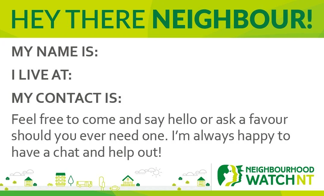 Through this campaign, Neighbourhood Watch NT encourages Territorians to take small steps to connect with those around them — whether that’s a friendly wave, a quick chat over the fence, or sharing contact details with trusted neighbours. Building positive relationships within our streets and communities helps foster trust, improves communication and creates a stronger network of people who care about the safety and wellbeing of their neighbourhood.