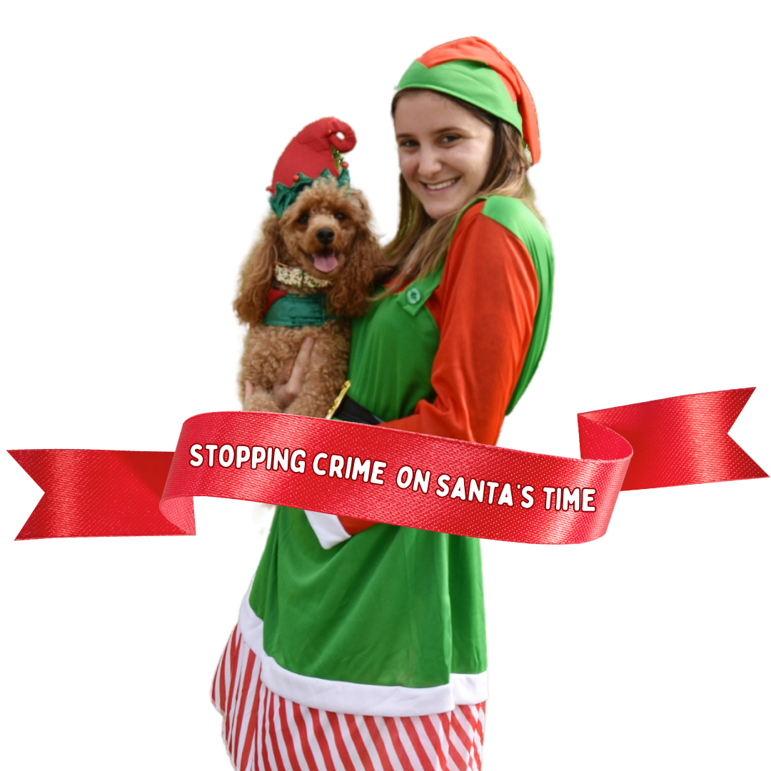 We’re Peppermint and Nami the Elf Pup — the Crime Prevention Elves sent straight from the North Pole to help Santa and Neighbourhood Watch NT keep the Territory safe this festive season.